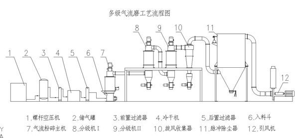 氣流磨的工作原理,是以高壓氣體產(chǎn)生得超音速氣流帶動物料進行自身碰撞粉碎。同時磨腔內的分級器對所粉碎物料分級,從而得到所需粒度產(chǎn)品。其粗粒留在腔內繼續(xù)粉碎。
